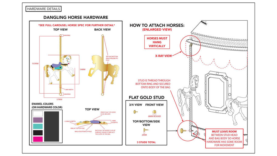 A significant project I worked on was designing a kitsch handbag for BJML, which required completing a full, 17-page CAD file. These kitsch bags are typically sold at prominent retailers such as Macy's, Von Maur, and Dillard's, with prices ranging from $88 to $168. My bag design "Spin Me" was released on the Betsey Johnson website in May of 2025 at a price of $142. It has been exhilarating to see my design work become a fully-realized product sold under one of the most successful, global fashion brands.